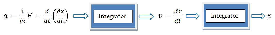 br>According to Newton's second law of motion, the force $F$ is related to the mass $m$ and acceleration $a:$ $$F=ma$$ Since the acceleration is the rate of change of velocity, by using the above equation, we have $$a={d}/{dt}({dx}/ {dt}) = {d^2x}/ {dt^2}={1}/{m} F $$ So, once we know the external force $F$ and mass $m,$ we can use the above equation to calculate the acceleration $a$. Now, as differentiation and integration are inverse processes, it is straightforward to notice that we can obtain our desired velocity ${dx}/ {dt}$ and position $x$ simply by applying integration operation twice on the acceleration $a$ since $a={d^2x}/ {dt^2}.$ Simulink provides us with an integration operation block called integrator to perform this task easily (see the picture below).